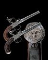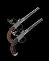 A PAIR OF 50-BORE FLINTLOCK TURN-OFF BOXLOCK SILVER-MOUNTED TRAVELLING PISTOLS, no visible serial number,