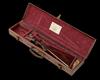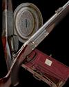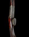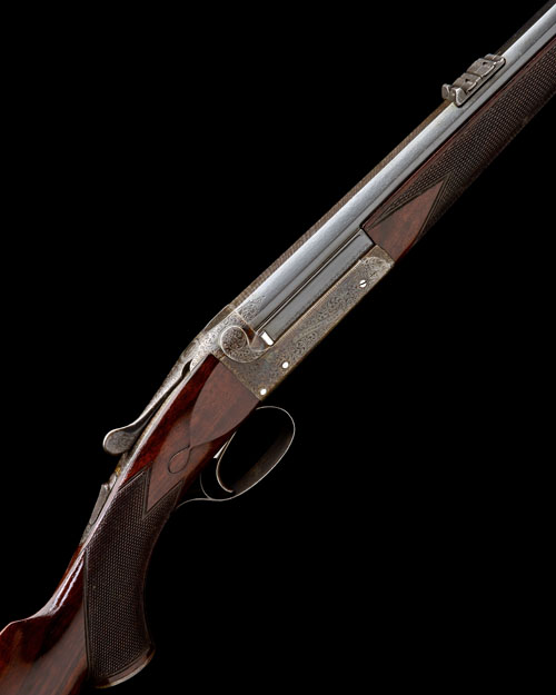 27in. black powder only octagonal barrel, top flat partially matted and engraved 'SHOT & REGULATED BY J. PURDEY & SONS, AUDLEY HOUSE, SOUTH AUDLEY STREET. LONDON', open sights and two folding leaf sights with white metal inlaid sight-lines and marked for 50, 100 and 150 yards, bead fore-sight, the breech end with some acanthus scroll detailing and marked 'J. 255.', trademark 'E' quality hammerless action with teardrop fences, and matted standing breech, removable striker disc, automatic safety with gold-inlaid 'SAFE' detail, non-selective ejector, the action and furniture profusely engraved with acanthus scrollwork with beaded borders, rounded bar with scrolling banners engraved 'J. PURDEY & SONS', retaining much original colour-hardening, 14 3/8in. highly-figured pistolgrip stock with engraved steel pistolgrip-cap, Hackett patent snap fore-end with horn finial, weight 5lb. 6oz., in its lightweight leather case with claret velveteen-lined interior and original Purdey trade label