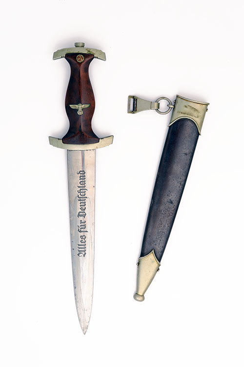 circa 1935, with double-edged 8 3/4in. blade etched with the motto ' ALLES FUR DEUTSCHLAND' (everything for Germany), makers mark to the reverse, brown wooden grip inlaid with an eagle and swastika and the 'SA' roundel to top of hilt, solid nickel fittings with area stamp 'Nm' (Nordmark) TOGETHER WITH its original brown anodised metal scabbard with nickel chape and throat (generally good order with some surface spotting to blade); TOGETHER WITH its leather belt hanger (leather split and dried)