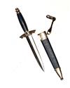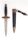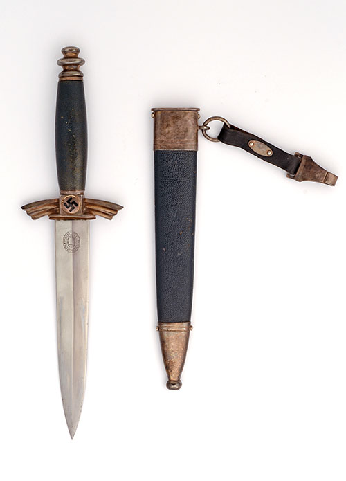 with 7in. double-edged blade, white-metal cross-guard with drooping quillions and black enamelled swastika centre, blue morocco leather covered grip and white-metal cast, turned pommel; TOGETHER WITH an original blue leather scabbard with issue-marked plated fittings and retaining an original black leather belt hanger and clip