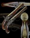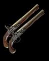circa 1770, with two-stage slightly swamped brass 10in. barrels banded and engraved at the intersection, acanthus scroll engraving and London proofs at breech, border engraved solid iron top-tang with later sighting grooves, flat border and scroll engraved locks signed 'WHATELY', en-suite hammers, unbridled frizzens, pointed tails, walnut full-stocks with silver wire scroll inlay around the top-tangs, rococo escutcheons to wrists, brass furniture including short-tailed grotesque mask butt-caps, pierced side-plates, double roll-edged trigger-guard bows, acorn finials and ramrod throats and pipes, complete with wood under-barrel ramrods