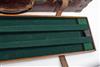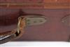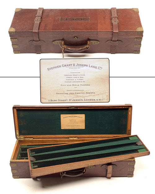 fitted for 30in. barrels (adapted for 28in), the interior lined with green baize, a Grant & Lang trade label, oak baize-lined removable tray, brass lock (including key), the lid exterior with the monogram 'T.G.D.'