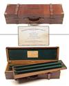 STEPHEN GRANT & JOSEPH LANG A BRASS-BOUND OAK AND LEATHER TWO-TIER TREBLE GUNCASE,