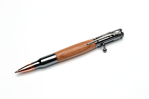PSI HAND MADE 'BOLT-ACTION' SHOOTER'S BIRO, recent, with a polished cherry-wood body, the pen barrel formed from a plated cartridge case with a full metal jacket nib, the mechanism operating on a locking bolt and complete with pocket hook formed as a sporting rifle, appearing unused, in a flock pouch
