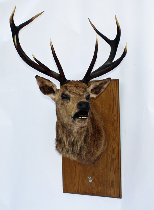 with ten points, mounted on a large wooden plaque, with small plaque engraved 'SHOT BY PETE KINGSLEY FORREST GLEN 1995', (broken repaired)
