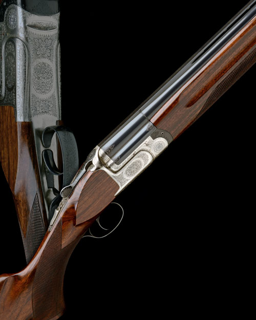 32in. nitro barrels with ventilated mid-rib and 9mm ventilated matt top-rib, 2 3/4in. chambers, bored approx. 1/2 choke in both, hold-open toplever, manual safety, bouquet and scroll engraving, brushed bright finish, 15in. figured pistolgrip stock including 1/2in. wooden extension, weight 8lb. 2oz., in a carton