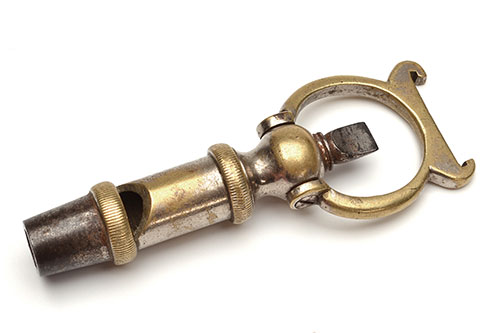 A RARE BRASS 12-BORE CARTRIDGE RING-EXTRACTOR COMBINATION-TOOL AND COMBINED WHISTLE, UNSIGNED,