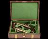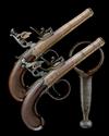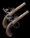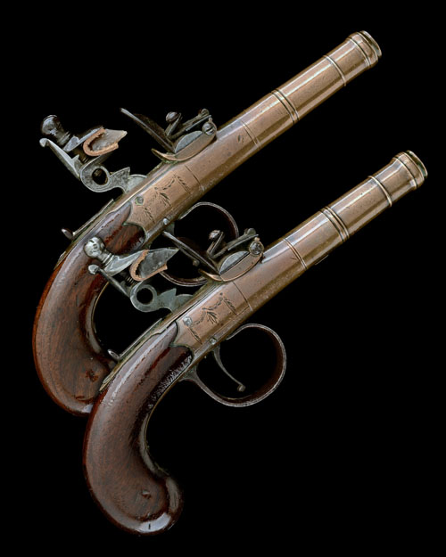 circa 1780, with turned tapering banded 2 1/2in. turn-off cannon-barrels (one frozen), rounded boxlock London proved actions, the left hand sides signed 'KINGDON' beneath engraved swags, the right hand sides framed by engraved swags, central hammers, raised pans, sliding safes to the top-tangs, smooth bag-shaped butts (one with old inlet repairs at head), and iron roll-edged trigger-guard bows;TOGETHER WITH a later early Victorian instrument case lined out in green baize and re-fitted for these pistols, complete with original barrel key