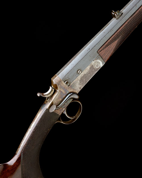 27in. octagonal nitro barrel (lined to .22LR from .300 Rook) with matt top flat, open sights and two folding leaf sights marked for 50, 100 and 150 yards, bead fore-sight, barrel engraved 'COGSWELL & HARRISON LTD. 141 NEW BOND ST. & 226 STRAND. LONDON.', non-selective ejector, plain action retaining traces of original colour-hardening (some rusting), 14 3/4in. well-figured pistolgrip stock with steel pistolgrip-cap and buttplate, weight 5lb. 11oz.