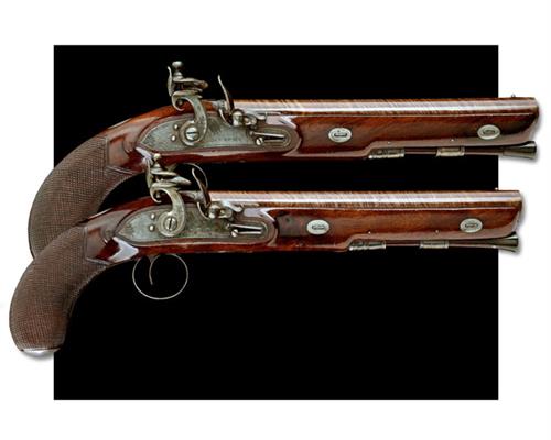 circa 1800, with browned round 9in. twist-iron barrels, full-length sunken sighting grooves signed 'DUBLIN' running back into the engraved iron top-tangs, bead fore-sights, plain flat borderline engraved pointed tail locks with acanthus leaf engraved detail, rain-proof pans, roller-bearings to the frizzen-springs, walnut full-stocks with chequered bag-shaped butts, white-metal oval escutcheons to the wrists, white-metal domed butt-caps, blued trigger-guards, pineapple finials, twin white-metal oval barrel-key escutcheons and horn-tipped ramrods, both pistols with much finish and appearing little-used