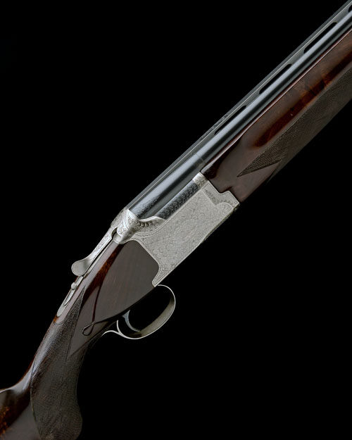28in. nitro barrels with 8mm ventilated matt top-rib, 2 3/4in. chambers, bored approx. 1/4 and 1/2 choke, hold-open toplever, manual safety with integral barrel selector switch, border and floral scroll engraving, bright finish, 14 1/2in. stock including 3/4in. rubber recoil pad, weight 7lb. 8oz.