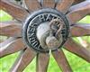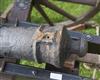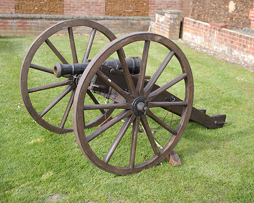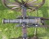 the 32 1/2in. cast barrel circa 1890 with a later proved steel liner, mounted on a wood field-carriage with approximately 63in. legs and 48in. wide to the ends of the axle with a pair of 42 1/2in multi-spoked wheels with iron tyres, the iron furniture with some gold-painted detail and complete with a pair of roped wheel-chocks