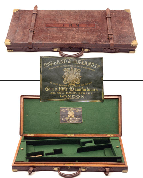 fitted for 28in. barrels (could adapt to 30in), the interior re-lined with green baize, with a Holland & Holland trade label, central brass push-button lock (including key), the lid exterior with the monogram 'J.R.M.'