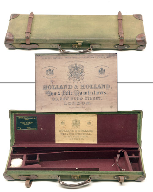 fitted for 26in. barrels, the interior lined with maroon baize, a Holland & Holland trade label, brass lock (key missing)