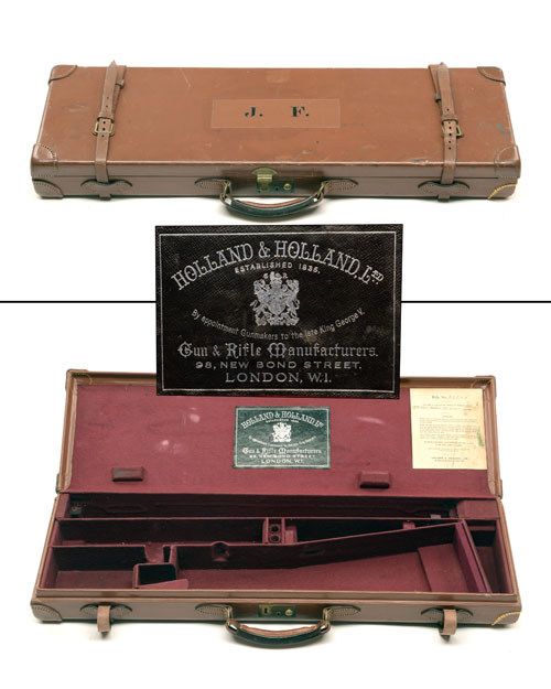 fitted for 25in. barrels (could adapt to 27in.), the interior lined with maroon baize, a leather Holland & Holland trade label, brass lock (key missing), the lid exterior with 'J.F.'