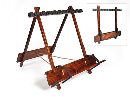 A TEAK PORTABLE FOLDING GUN RACK WITH LEATHER LINING AND BRASS MOUNTS,