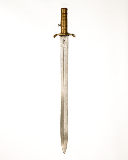 and dated for 1845, with 21 3/4in. symmetrical leaf-shaped blade, blind fuller for the first half of its length, one side stamped at the forte 'ENFIELD 1845' together with a small 'VR' crown cypher, the reverse stamped 'W.S.' with an ordnance over-stamp, brass cross-guard with turned down quillions, brass ribbed hilt with bar-slot and pan-headed release button, missing scabbard