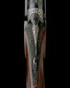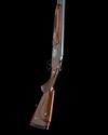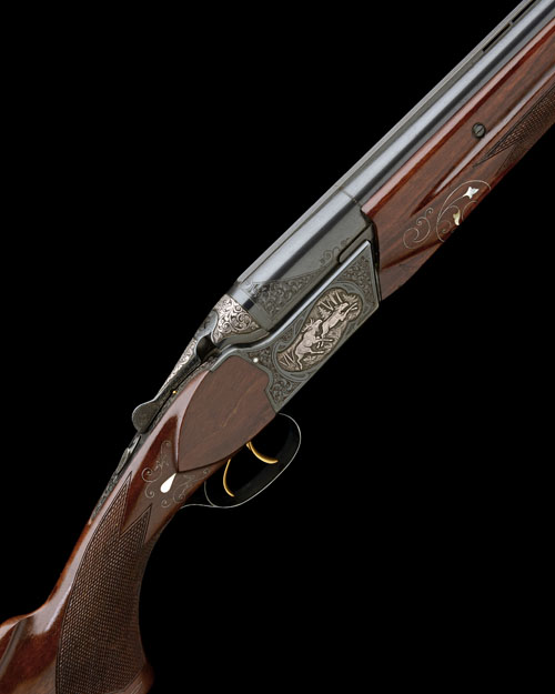 28in. nitro reproved barrels (in 2010) with 7mm ventilated matt top-rib and permanently attached fore-end, 2 3/4in. chambers, bored approx. 3/4 and full choke, hold-open toplever, cocking indicators, manual safety, gold-washed triggers, the blacked action carved in relief with acanthus scrollwork on a matt background surrounding vignettes of running stag and doe in wooded landscapes with a bright polished finish, the top fence and toplever carved in relief with acanthus scrollwork on a matt background in a bright polished finish, 14 3/4in. pistolgrip stock including 1in. ventilated rubber recoil pad, with raised cheekpiece inlaid with scrolling wire and a solitary mother of pearl mallard in flight, the stock and fore-end inlaid with scrolling wire with mother of pearl leaves and game birds, and mother of pearl inlaid drop points, weight 6lb. 13oz.