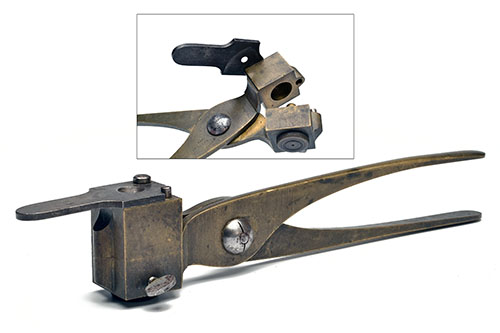 A RARE 14-BORE OPPOSITE-OPENING BRASS BULLET-MOULD FOR A PAPER-PATCHED HOLLOW-BASED PROJECTILE WITH MICROMETER BASE-PLUG,