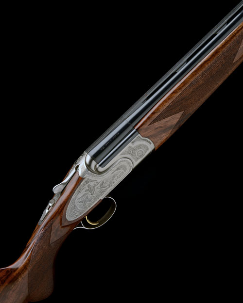 32in. nitro barrels with ventilated mid-rib and 10mm ventilated top-rib, 3in. chambers, multichokes (with spares), hold-open toplever, automatic safety with integral barrel selector switch, gold-washed trigger, bouquet and scroll engraving, the decorative sideplates engraved with scenes of flushed partridges and a hound flushing game, bright finish, 14 1/2in. semi-pistolgrip stock including 1/4in. wooden extension, weight 7lb. 11oz., in its makers universal case