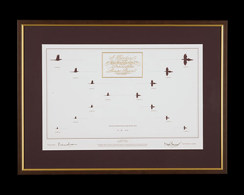 no. 69 of 200, central gold embossed Purdey trade label, surrounded by scale illustrations of pheasant in flight with apposite distances, with explanatory note: 'AT ONE ARM'S LENGTH, THE SIZE OF THE BIRD ON THE PRINT IS AS IT WOULD IN REALITY AT THE INDICATED DISTANCE. MEMORISE THE SILHOUETTES IN ORDER TO BETTER JUDGE THE LEAD AND THE DISTANCE IN REAL SHOOTING SITUATION' signed by Richard Purdey and Nigel Beaumont, Chairman.
