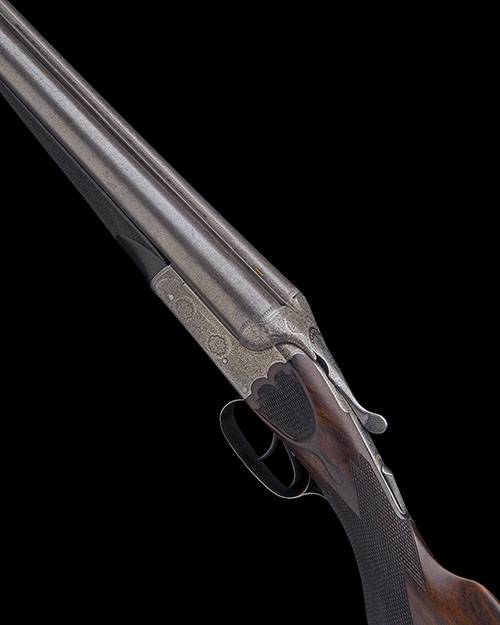 25 3/4in. nitro reproved fine damascus barrels (shortened), filed rib with acanthus scroll engraving at the breech end and gold-inlaid '1', name banner engraved 'WILLIAM LEE. 28. LANCASTER STREET. BIRMINGHAM & KIMBERLEY. 3461', 2 1/2in. chambers, cylinder in both, scroll-back treble-grip action with side-clips, sculpted toplever gold-inlaid '1' and 'EJECTOR', automatic safety with gold-inlaid 'SAFE' detail, fully engraved with floral bouquets and acanthus scrollwork, bright finish 15in. figured semi-pistolgrip stock with ornately carved recessed chequered side panels and engraved steel heel and toe plates, decoratively chequered fore-end, weight 6lb. 9oz.