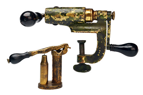 circa 1910, comprising of a capper de-capper unit of lacquered brass on an oval hollow-base, the base marked '8' over 'W. BARTRAM' over 'PATENT', the opposite side marked 'NIMROD' together with a trademark, turned wood operating handle with cavity for spare de-capping pins (two included, hinge screw replaced) and a large roll turn-over tool with bench mounting screw, green painted brass body (losses to paint) and turned wood operating handles, the compression arm signed 'NIMROD' with the trademark and 'W. Bartram PATENTEE' together with the number '8', serial number to reverse