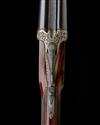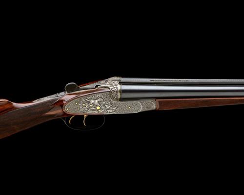 27 5/8in. (70cm.) nitro reproved barrels (in 2015), the rib gold-inlaid 'LUD. BOROVNIK - FERLACH.' and the tubes gold-inlaid with a band at the breech end, 2 3/4in. chambers, bored approx. 1/2 and 3/4 choke, treble-grip action, removable striker discs, manual safety, gold-washed internals, articulated front trigger, the fences carved in relief with acanthus scrolls, the action and lockplates engraved with acanthus scrollwork set against a matt background interspersed with game scenes, 14in. figured stock including buttplate, weight 5lb. 13oz., in its makers brass-cornered case