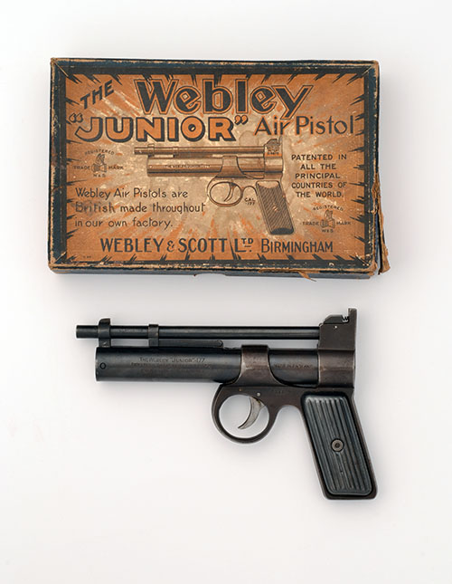 circa 1936, with blued 6 1/2in. barrel, blade fore-sight, fixed rear-sight, blued air-chamber with the maker and model details, ribbed tin-plate grips, two-pin trigger-unit, the whole retaining a strong amount of original finish; TOGETHER WITH its manufacturer's card carton, orange 'star-burst' label to the outside of lid, instruction label to the inside, blue card tray retaining a price list, advert for 'Webley's Pistol Case', targets, darts and a paper sample packet for pellets (empty), box edges scuffed, one corner torn