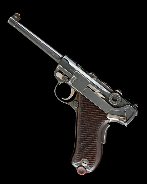 for 1933, with 4 3/4in. sighted barrel, blued receiver, blued toggle with knurled cocking-pieces, the top of toggle stamped with a Swiss cross over 'WAFFENFABRIK BERN', blued frame with grip-safety, chequered walnut grips, much original finish remaining including 'straw' to the ancillaries; COMPLETE WITH its leather service issue holster marked for 1914