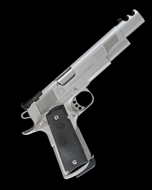 for 1990, with compensated bush-less 6 1/4in. barrel including dual-port compensator, blade fore-sight, 'Bo-Mar' adjustable rear-sight, front and rear finger-grips on slide, chequering to rear of slide, skeletal lightweight hammer, extended ambidextrous safe, extended beaver-tail to the grip-safety, stainless frame with chequered front-strap, flat mainspring housing and trigger-guard bow, 'Hogue' stippled soft rubber grips, extended magazine release, enlarged and extended magazine well and complete with four magazines all with extended rubber bumpers to base; TOGETHER WITH an 'MTM CASEGARD' foam-lined abs plastic case