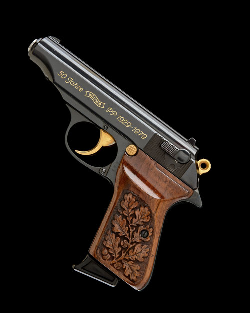 manufactured in 1979, with 4in. polished barrel, finely blued sighted slide with the serial number and calibre inlaid in gold on the right hand side and '50 JAHRE WALTHER PP 1929-1979' inlaid in gold on the left, gilt finish to the ejector claw, trigger blade, magazine release catch and hammer, polished blue finish with matt sides to the frame, fitted with 'Walther' trademarked walnut grips hand carved with acorns and oak leaves; TOGETHER WITH a wood case, the interior lined in red velvet for the pistol and complete with a spare pair of smooth ivorine grips
