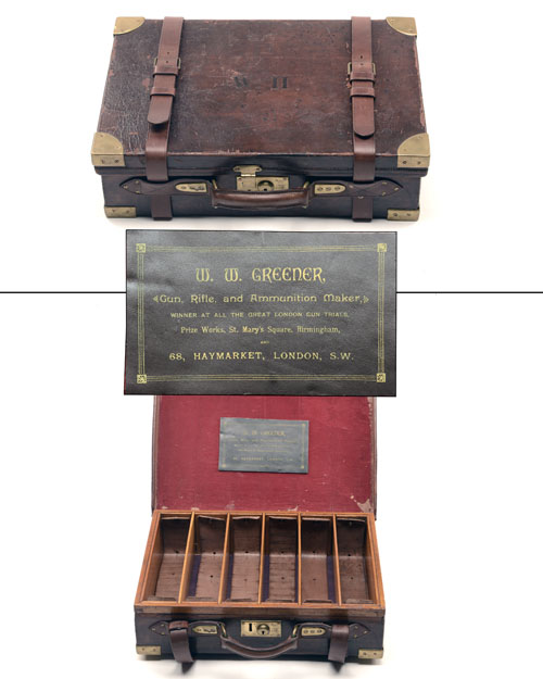 fitted for approx. 300 cartridges, the lid interior lined with red baize (some moth damage), a W.W. Greener trade label, oak body, five oak dividers, six leather lifters, brass lock (key missing), the lid exterior initialled W.H.