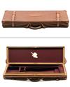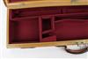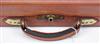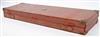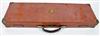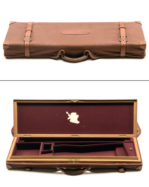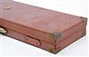 fitted for 30in. barrels, the interior lined with maroon baize (the lid interior label badly removed), central brass push-button lock (key missing), canvas outer