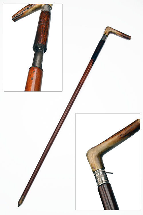circa 1900, with 27in. cane-covered barrel, twist and pull cocking action with concealed trigger in the plated band, right-angle natural stag-horn handle and screw-off pointed brass ferrule at muzzle