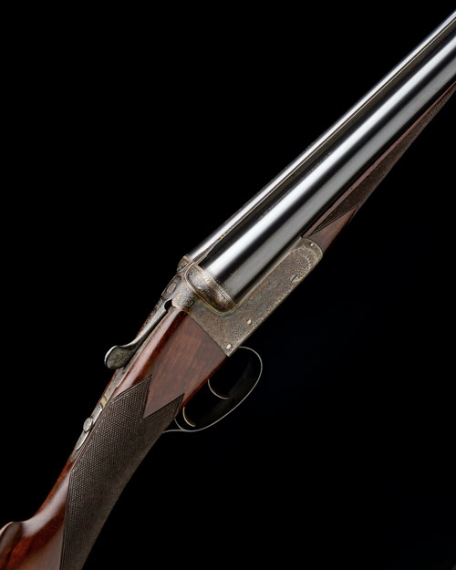 22in. nitro reproved barrels, matt Churchill rib gold-inlaid '22' at the breech end, the tubes engraved 'E.J. CHURCHILL (GUNMAKERS) LTD. ORANGE ST. GUNWORKS. LEICESTER SQUARE. LONDON.', 2 1/2in. chambers, bored approx. 1/4 and 3/4 choke, treble-grip action with hidden third bite, slim fences, automatic safety with gold-inlaid 'SAFE' detail, floral bouquet and acanthus scroll engraving, the makers name in scrolling banners, the underside engraved and gold-inlaid in a cartouche 'UTILITY "22" MODEL', retaining much colour-hardening and finish, 15 1/2in. burr walnut stock (likely replacement), weight 6lb. 4oz., in its canvas and leather case with gold-tooled trade label