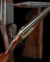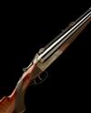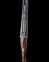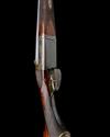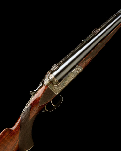 24in. nitro chopperlump barrels, sight rib deeply carved with bold acanthus scrolls, open sights and two folding leaf sights with white metal inlaid sight lines and marked for 100, 200 and 300 yards, sunken rib engraved with the makers name and with shell and scroll detailing at the muzzle end, block mounted bead fore-sight with flip-up moonsight and fold-over protector, treble-grip action with hidden third bite, manual safety with gold-inlaid 'SAFE' detail, profusely engraved with bold acanthus scrollwork, retaining much colour-hardening and finish, 14 1/8in. figured pistolgrip stock with cheekpiece, sling eyes, engraved and colour-hardened steel pistolgrip-cap, including rubber buttpad, fore-end with Deeley & Edge patent release catch and horn finial, weight 10lb. 4oz., in a leather case