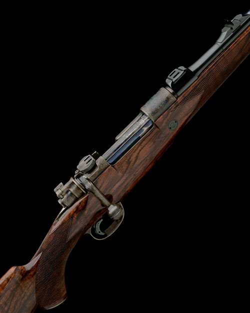 25 3/4in. nitro barrel gold-inlaid 'HARTMANN & WEISS . HAMBURG - LONDON', ramp-mounted open sights and ramp-mounted bead fore-sight with flip-up moonsight, receiver (with thumb cutout) mounted with a Zeiss Diavari-Z 2,5...10x52T* telescopic sight in quickly-detachable mounts, fine acanthus scroll engraving, the bolt handle with progressive cut radial chequering, flag safety with gold-inlaid 'F' and 'S' details, florally-engraved recoil blocks, retaining much original colour-hardening, highly-figured pistolgrip stock with cheekpiece, sling eyes, engraved and colour-hardened steel pistolgrip-cap, 14 5/8in. pull including 1in. rubber recoil pad