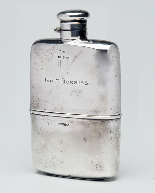 signed 'L.G.' and hallmarked for 1891, of approximately 1/4 pint size with bayonet locking captive cap and gilt-lined cup, the front-face inscribed 'IAN F. MORRISS'