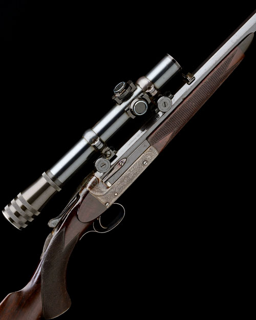 26in. octagonal black powder only barrel with partially matted top flat, open sights and two folding leaf sights with white metal inlaid sight lines and marked for 50, 100 and 150 yards, bead fore-sight, the breech end engraved 'HOLLAND & HOLLAND, 98, NEW BOND ST. LONDON. WINNERS OF ALL THE 'FIELD' RIFLE TRIALS. .250 SEMI SMOOTH BORE', and mounted with a vintage B. Nickel telescopic sight in quickly-detachable rail mounts, teardrop fences, removable striker disc, automatic safety with gold-inlaid 'SAFE' detail, non-selective ejector, beaded border and bold acanthus scroll engraving, the makers name in a scrolling banner, retaining some original colour-hardening and traces of finish, 14 3/4in. pistolgrip stock with cheekpiece, engraved steel pistolgrip-cap, steel buttplate, Hackett patent snap fore-end with insert repair, horn finial, weight 6lb. 12oz.