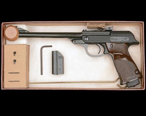 circa 1965, with black gloss anodised 9 1/2in. barrel, black crackle-finished receiver marked with the Walther trademark, brown chequered plastic grips, remaining in fine condition with virtually all its original finish; TOGETHER WITH its manufacturers wood-grain effect card box, short muzzle-weight, allen key, spare sight elements and brass cleaning rod