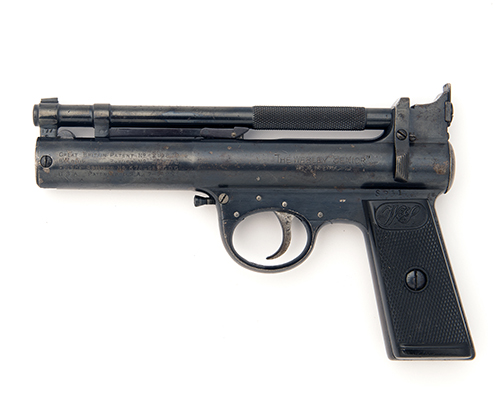 circa 1930, with incorrect replacement sighted rifled 6 1/2in. barrel (drilled at muzzle), blued stepped air-chamber marked with five lines of patents on the left hand side together with the model designation, Birmingham address and six lines of patents on the right, four pin trigger-group with MKI style trigger-adjuster (locking screw replaced), chequered hard rubber grips embossed with the 'WS' monogram (one with chip at rear), the whole retaining a fair amount of factory blue finish
