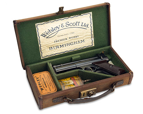 circa 1937, with sighted rifled 6 1/2in. barrel (some re-finishing to barrel only), blued stepped air-chamber with three lines of patent dates and model designation, three pin trigger-group, chequered brown bakelite grips, the whole retaining virtually all its factory blue finish except where noted; COMPLETE WITH its pre-war brown canvas and leather case, the interior lined in green baize, the inside of lid with a printed gold and blue foil trade-label stating 'WEBLEY & SCOTT LTD, ESTABLISHED 1790, PREMIER WORKS, BIRMINGHAM', the case containing compartments for an oil tin (present, by Parker-Hale, not Webley) and an orange rectangular pellet-tin for 'WEBLEY SPECIAL PELLETS' (empty), the outer with single locking clasp and key