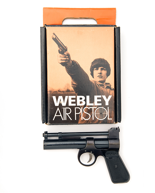 circa 1970, with blued smoothbore 6in. barrel, adjustable rear-sight, left side of air-chamber with model details and Birmingham '4' address, two pin trigger-group, chequered black plastic grips embossed 'WEBLEY' at the tops, some fading to finish on frame parts TOGETHER WITH its manufacturers card carton, with orange coloured illustrated lid (some scuffing)