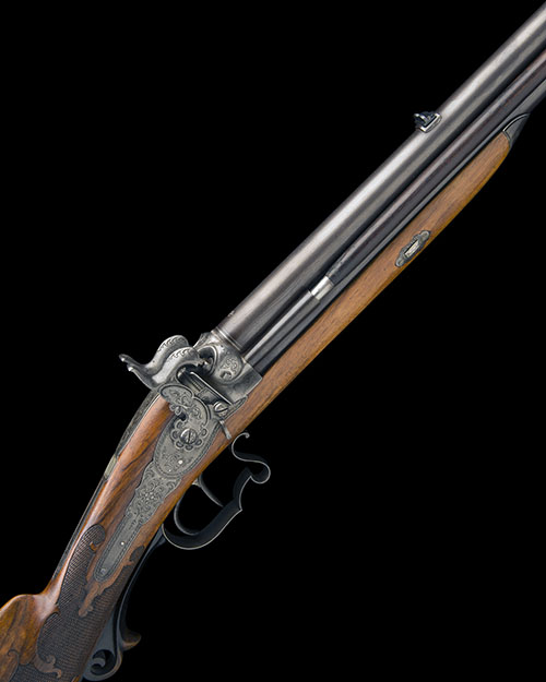 circa 1850, with browned 30in. rifled barrels, the left hand rib convex, the right hand sunken with provision for ramrod (present), the top of barrel signed in silver 'ADAM KUCHENREUTER IN REGENSBURG' together with an oval silver poincon of a standing stag, bead fore-sight on a moulded ramp, dove-tailed rear-sight with additional folding leaf, white metal bands at breech, carved and engraved percussion fences and snails, screwed plugs with square sockets, borderline and scroll engraved top-tang with central 'cigar-band' rectangular escutcheon, border and scroll engraved back-action locks with moulded irregular edges and rotating hammer-block safes forwards of the hammers, figured walnut half-stock with finely chequered wrist, raised roll-edge cheek-piece, carved wood patchbox to right hand side, iron heel-plate with scroll engraved detail, moulded horn trigger-guard tang cover, scrolled trigger-guard bow, set trigger to bottom barrel, provision for sling, the whole expertly restored