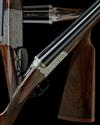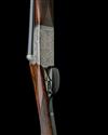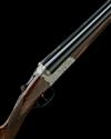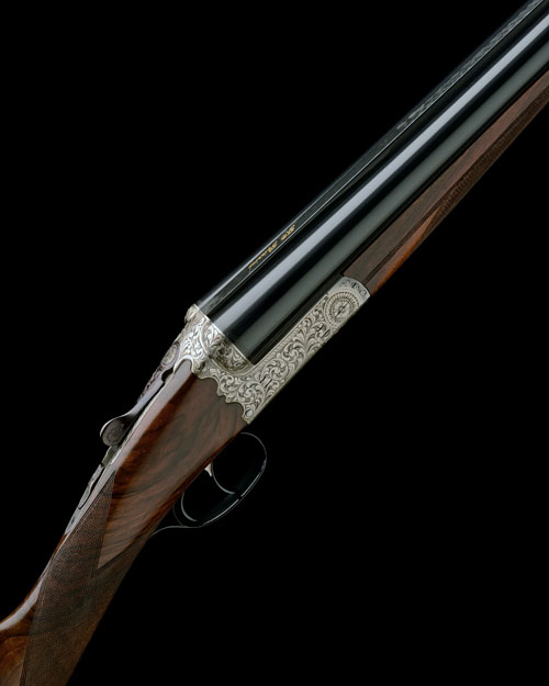 27 5/8in. (70cm) nitro barrels with raised tapered file cut rib, gold-inlaid in script at the breech end with the makers name, 2 3/4in. chambers, bored approx. true cyl. and 1/2 choke, ornately scroll-backed action, manual safety, profusely carved in low relief with scrolling acanthus and floral designs on a stippled background, bright and blued finish overall, 14 3/8in. highly-figured stock including 3/4in. rubber recoil pad, 10in. fore-end, weight 6lb. 15oz., in a leather case