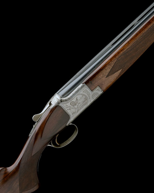 27 1/2in. nitro barrels with 12mm ventilated matt top-rib, 2 3/4in. chambers, bored approx. true cyl. and imp. cyl. choke, hold-open toplever, manual safety with integral barrel selector switch, gold-washed trigger, beaded border and acanthus scroll engraving with game scenes of pheasant, capercaillie and partridge, signed 'L. LAMBERT', bright finish, 14 5/8in. figured pistolgrip stock including 1/2in. rubber recoil pad, weight 7lb. 4oz.