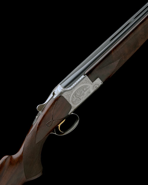 27 1/2in. nitro barrels with 12mm ventilated matt top-rib, 2 3/4in. chambers, bored approx. true and imp. cyl., hold-open toplever, manual safety with integral barrel selector switch with gold-inlaid 'O', 'U' and 'S' detail, gold-washed trigger, acanthus scroll engraving surrounding vignettes of two flushed mallard in a wetland setting on the right, of a brace of pheasant in flight on the left, signed 'R. Coenen', silver finish, 15in. figured (possible replacement) pistolgrip stock with drop points and including 1in. extension, weight 7lb. 8oz