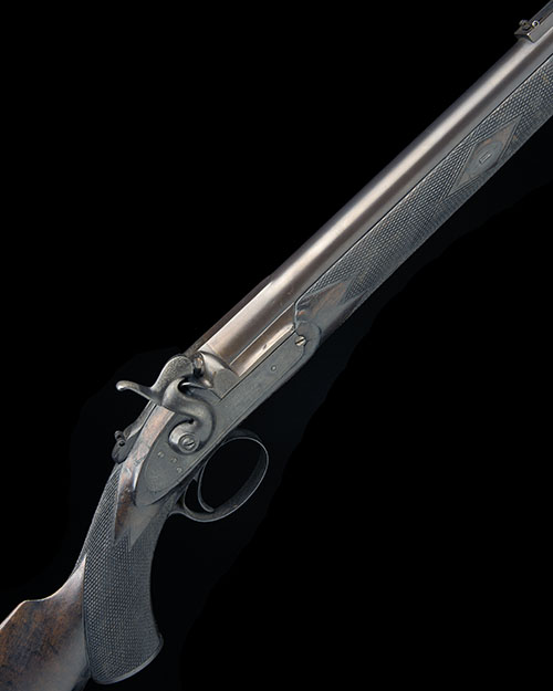 circa 1865, with round 36in. heavy barrel, short sighting rib at breech marked 'LANCASTER'S PATENT', block at muzzle for for fore-sight (missing), base for rear-sight (missing ladder) and provision for tang-sight, borderline and scroll engraving at breech, border engraved bar-action lock signed 'C.W. LANCASTER, 151 NEW BOND ST., LONDON', scroll engraved hammer, walnut half-stock with chequered capped pistol-grip and fore-end, full-length trigger-guard tang, iron furniture, and moulded horn fore-end tip with no provision for ramrod.