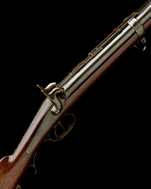 Other Notes: Conceived by Colonel John Jacob as a suitable arm for his locally raised regiments in Jacobabad, these interesting rifles only saw very limited field use in India. Weighing in at a not inconsiderable 11lbs they were somewhat unwieldy, and ballistically they had more in common with the obsolete Brunswick rifle than the then current Minie rifle. The service life of these rifles coincided with a period of popularity in India for explosive bullets with Jacob famously designing such a missile. Jacob raised a regiment of cavalry known as Jacob's Horse in 1846 and two regiments of infantry in 1857 known as Jacob's Rifles, both units being incorporated in the regular Indian Army respectively in 1860 and 1861. Jacob died in Jacobabad in December 1858 before delivery of his now famous rifle began.